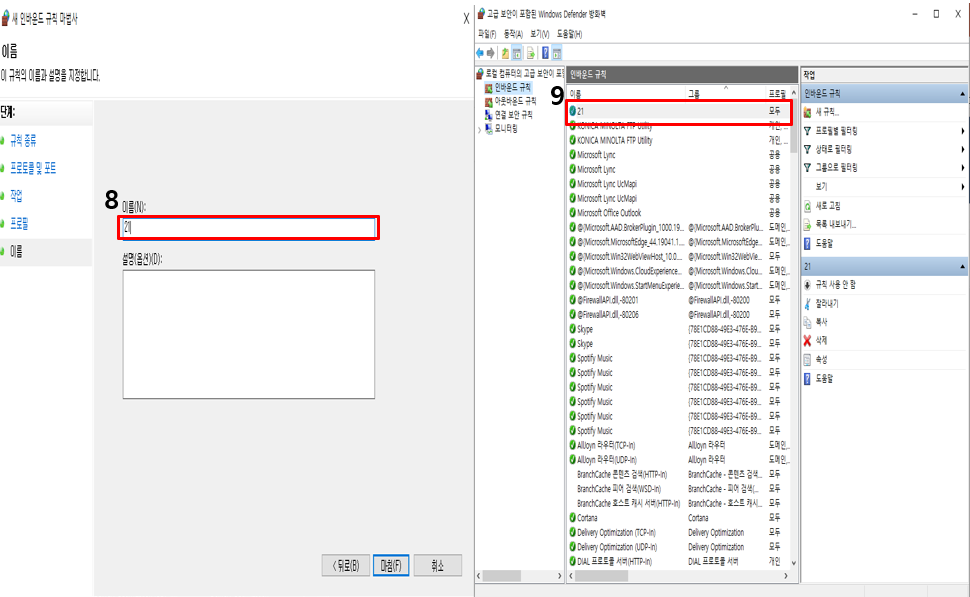 9. 인바운드 규칙에 21이 추가 되어 있으면 방화벽 설정 완료