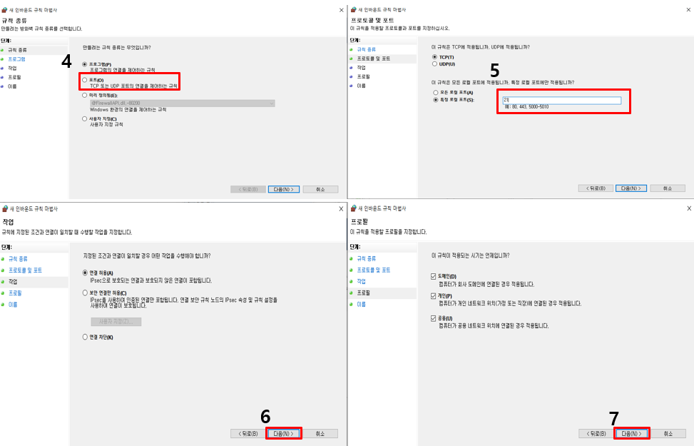 여기 까지 설정 완료 했으면 마지막으로 방화벽만 해제 해주시면 됩니다.