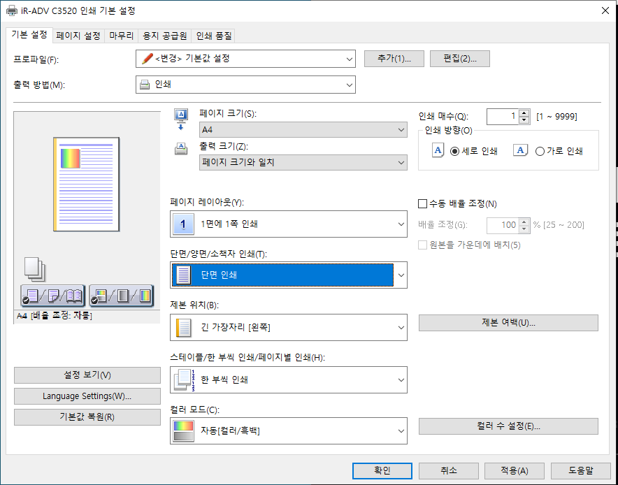 (윈도우 시작 버튼 - 설정 - 장치 - 프린터 및 스캐너 - 복합기 드라이버 선택 ex) iR-ADV C3520 - 관리 - 인쇄 기본 설정)