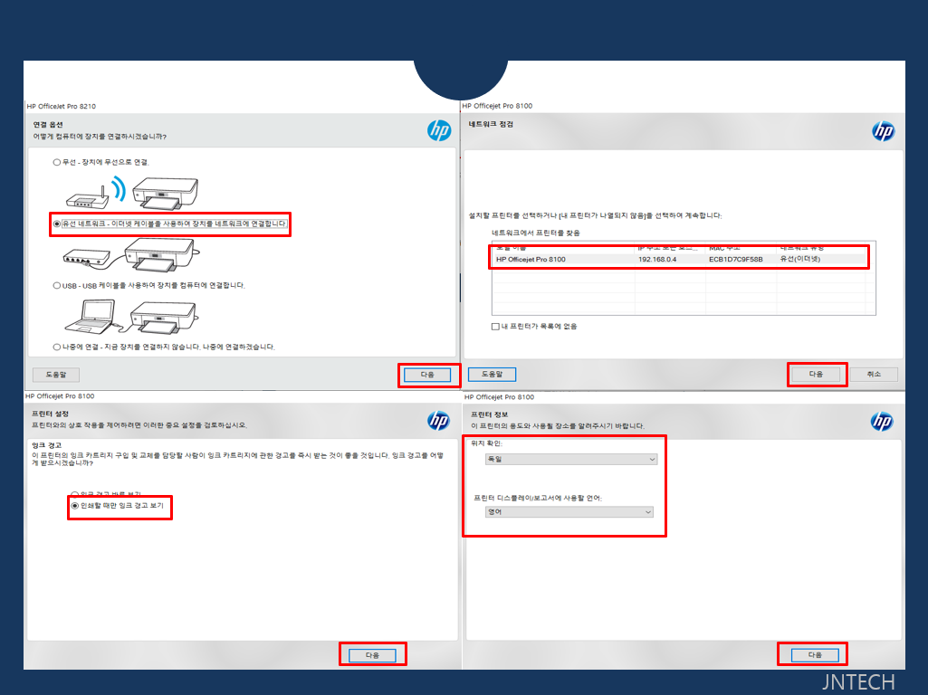 5. 유선 네트워크 체크 후 다음 ( 복합기에 랜선을 연결하시면 자동으로 ip를 부여받습니다. )